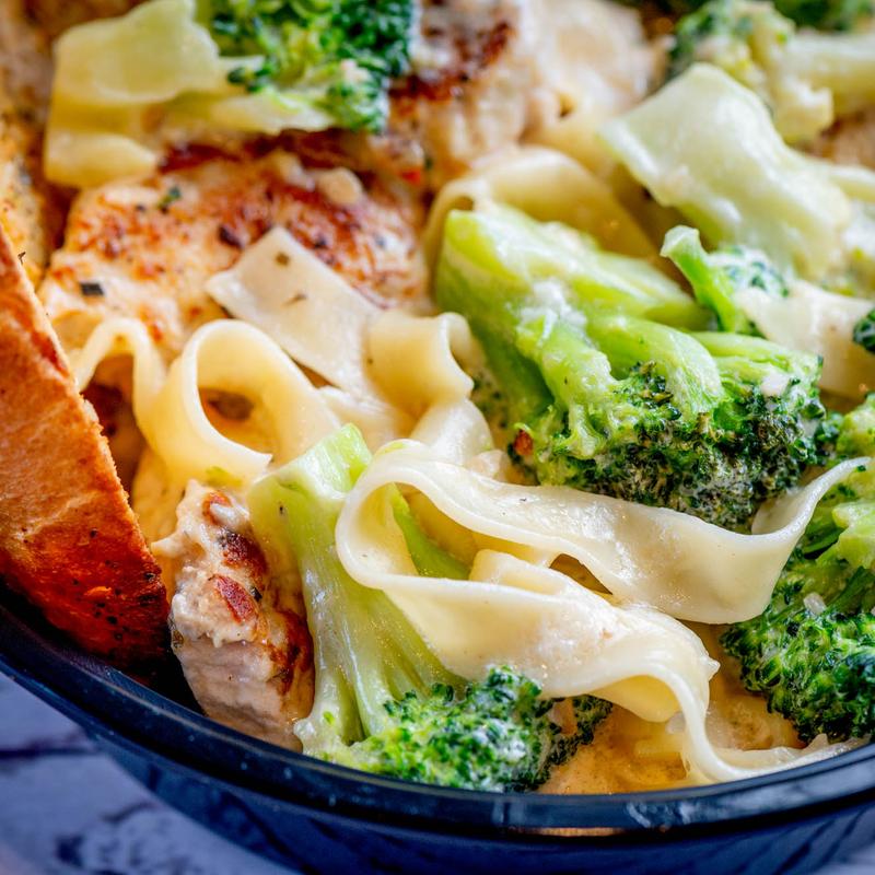 Grated Cheese, Alfredo Sauce, Penne (Ziti), Grilled Chicken, and Broccoli