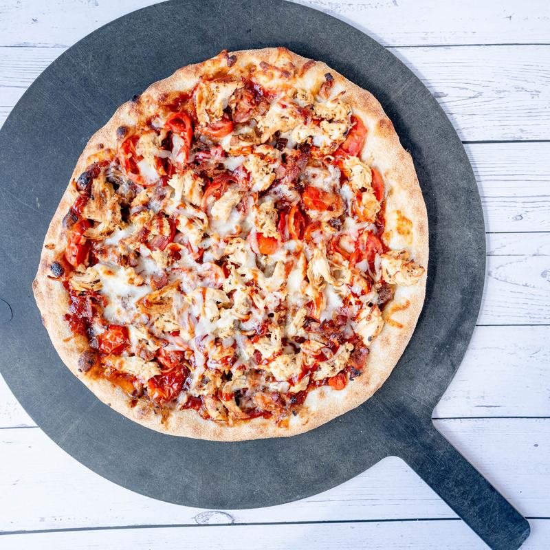 Side Marinara, Pizza Cheese, Grilled Chicken, Bacon, Caramelized Onions, and Tomatoes | Sm $18.69 | Lg $24.99
