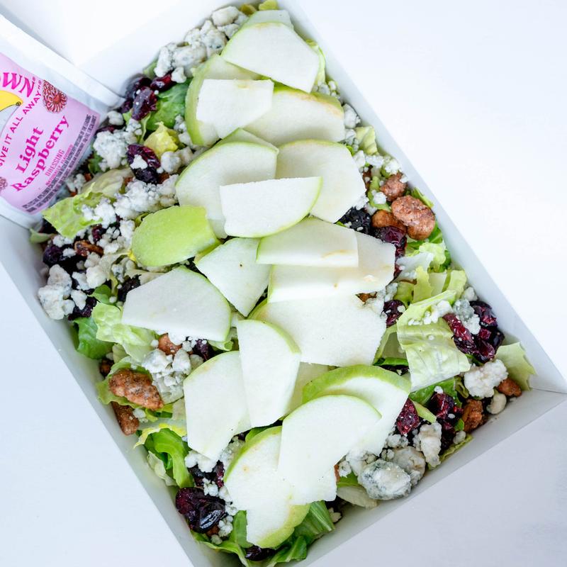 White Wrap, Crumbled Blue Cheese, Romaine Lettuce, Green Apple, Candied Pecans, Dried Cranberries, Grilled Chicken, and Raspberry Dressing