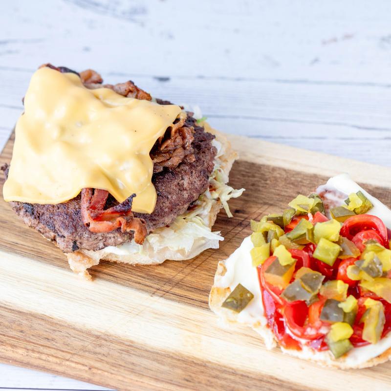 1000 Island, Pizza Cheese, American Cheese, Hamburg, Pickles, and Caramelized Onions | Sm $18.69 | Lg $24.99