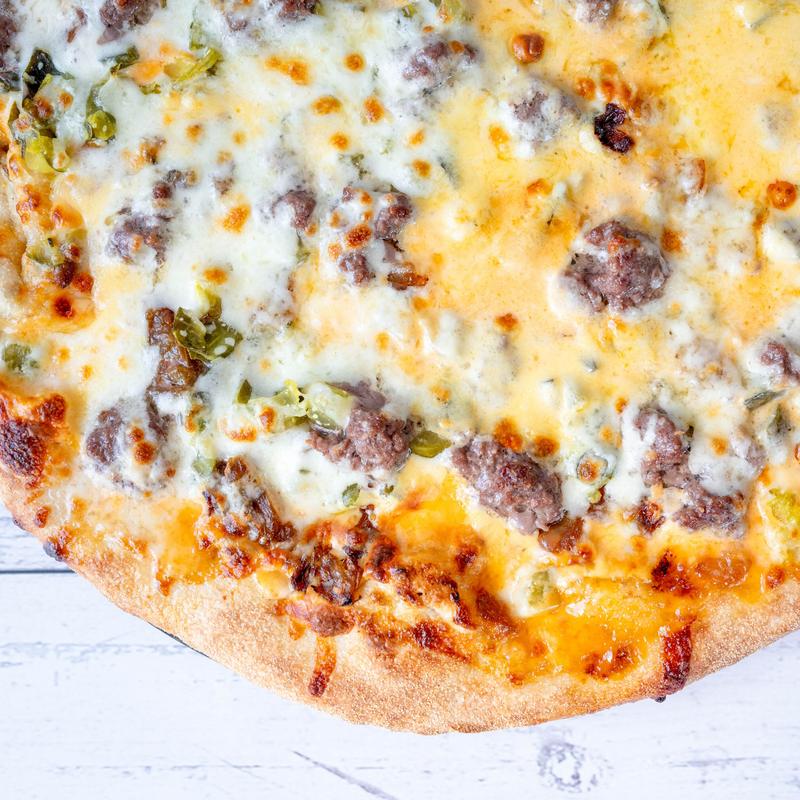 Pizza Sauce, Pizza Cheese, American Cheese, Steak, White Onions, Green Peppers, and Mushrooms | Small $18.69 | Large $24.99 | Gluten-free $19.99